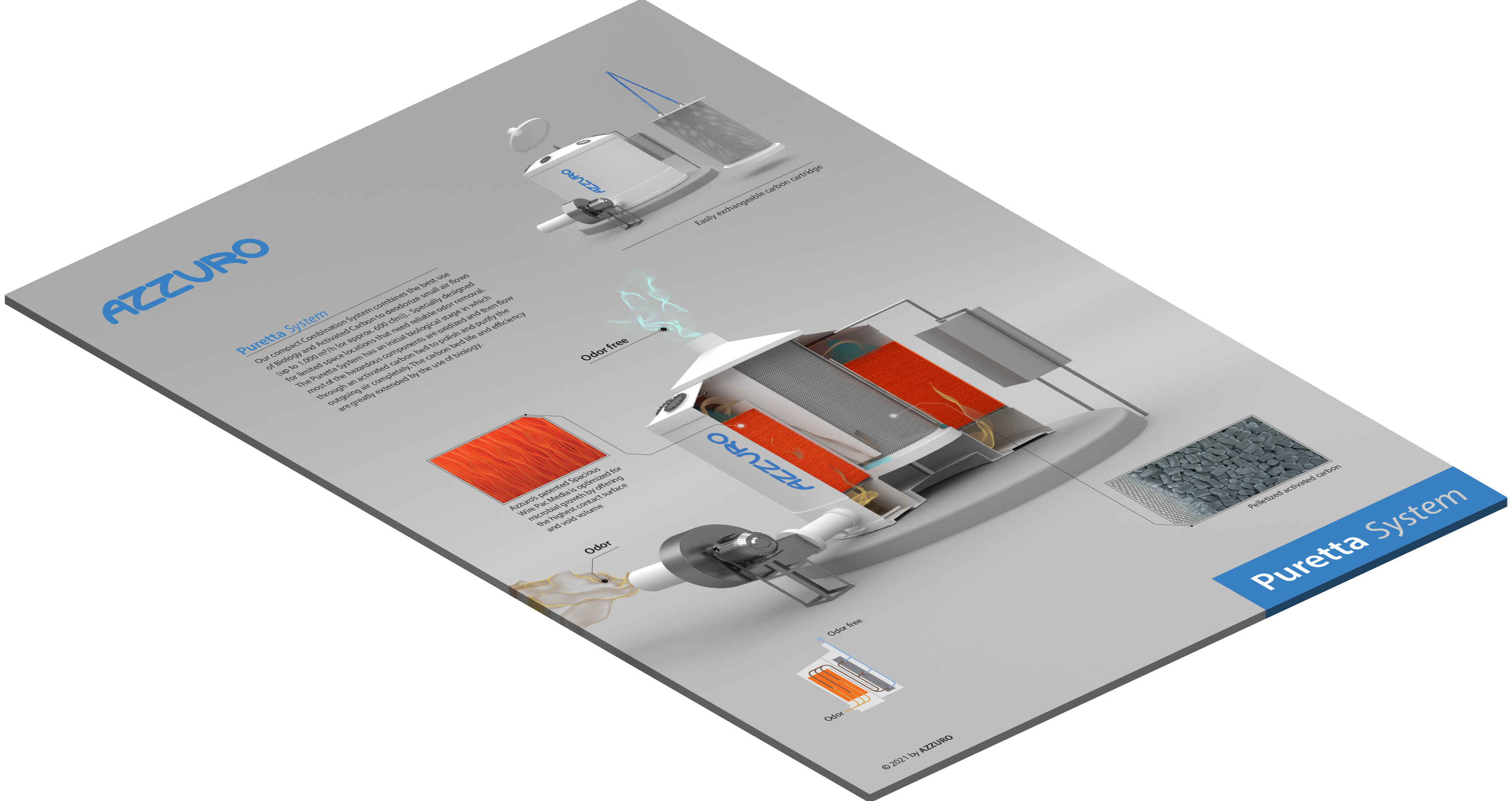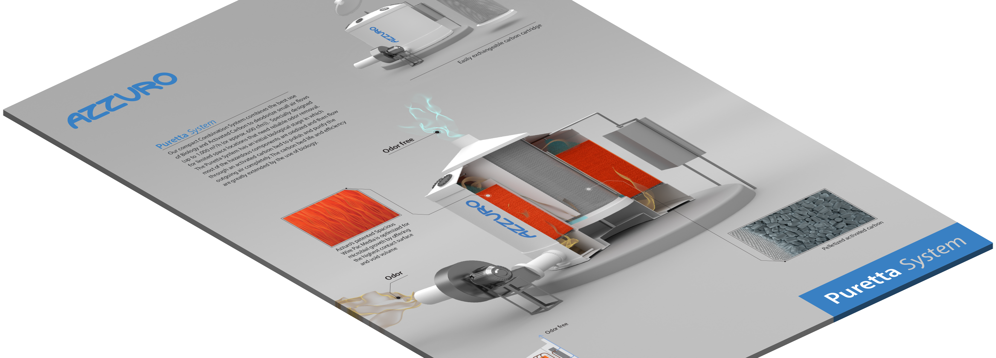 PURETTA, an original from AZZURO, measures 6.5 ft in both diameter and height. This robust, compact system combines biology and activated carbon to deodorize small airflows (up to 750 cfm). Designed for spaces with limited room that still need reliable odor removal, the biological element extends the carbon bed’s life and boosts efficiency. The reduced need for carbon replacements cuts operational costs, making it a more economical solution.