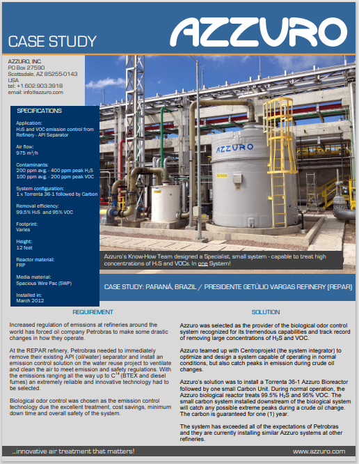 Learn More >AZZURO’s biological petrochemical emission control systems are proven to reduce over 99.5% H2S and SO2 for refineries and other oil production facilities.